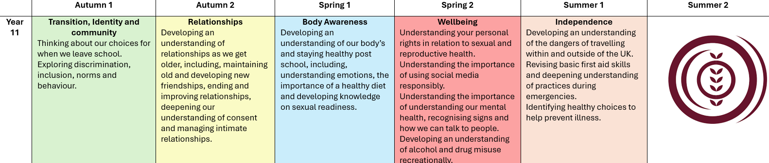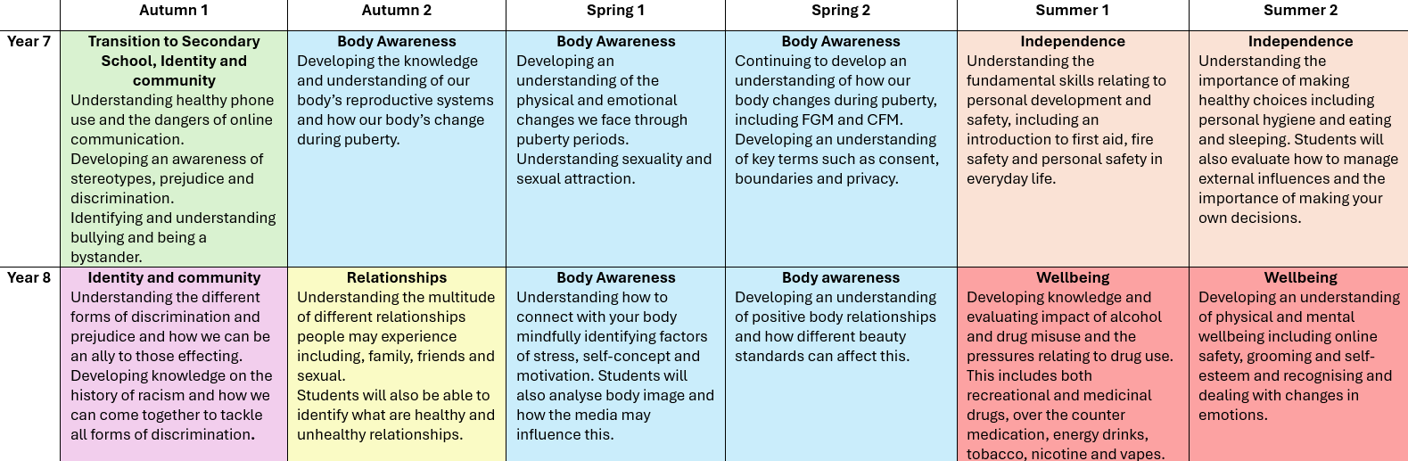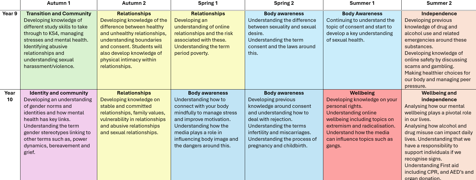 Guidance is delivered in 6 half termly units, each academic year, and is organised into three themes: Health and Wellbeing, and Relationships. The topic of Living in the Wider World, which covers careers, citizenship and finance are delivered through AM'PD and themed weeks across the year. These themes are also covered and embedded across a range of curriculum subjects.